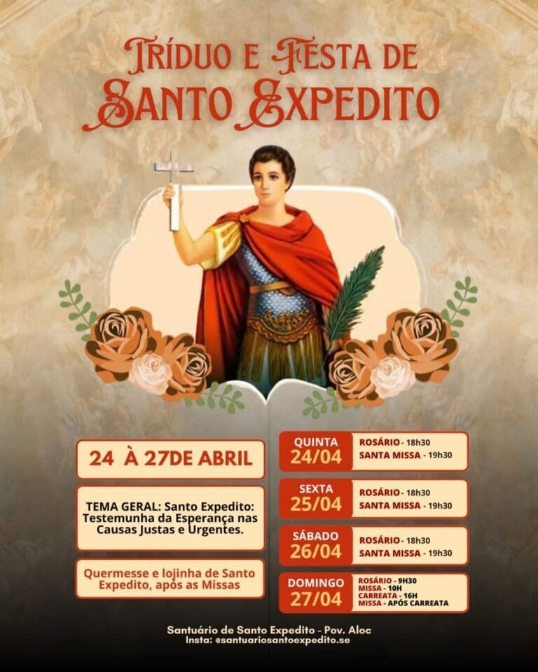 A devoção a Santo Expedito, conhecido como o intercessor das causas justas e urgentes, mobiliza centenas de fiéis na Arquidiocese de Aracaju. De 24 a 27 de abril, o Santuário de Santo Expedito, localizado no povoado Aloque, será palco de intensa programação, com destaque para o tríduo preparatório, missas festivas e a tradicional carreata. Com […]